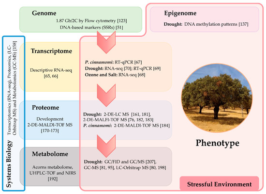 The present review is, to our knowledge, together with Kremer et al. [216], the only manuscripts that deal with molecular studies developed in the genus Quercus. This kind of studies started with the development of an EST catalogue performed in Q. petraea and Q. robur to be used in ecosystem genomics studies twenty years ago [155]. It is remarkable that the first whole genome sequencing of a species included in the genus Quercus, Q. robur, has been carried out five year ago [46], in comparison to the first genome sequencing in plants, A. thaliana carried out 20 years ago in 2000 [217], or in forest trees, Populus trichocarpa in 2006 [112]. To date, massive analysis methodologies have been developed (genomics, epigenomics, transcriptomics, proteomics, and metabolomic) implemented with other information (such as classical biochemistry or physiological data) that have helped to understand key concepts such as stress in the biology of forest species [129,218].
