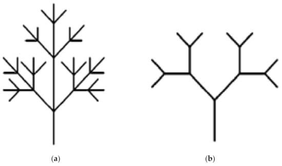Test objects with (a) one of the three monopodial branching testing trees, (b) one of the three Y-shaped sympodial branching testing trees.