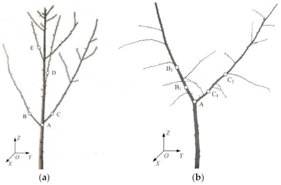 When executing vibration tests in fruit trees, the sensor must be properly positioned on both the branches and the trunk to obtain more tree vibration characteristics. In this study, four sensor points were arranged on each test tree. In each of the six trunks, a point was selected and was labeled as Point A. For monopodial branching trees, four main branches were marked Points B, C, D, and E (Figure 2a). For Y-shaped sympodial branching trees, two in each of the Y-shaped branches were selected and marked as Points B1, B2, C1, and C2 (Figure 2b).