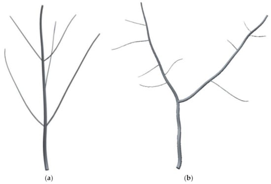 Under the assumption that the branch section is circular, the diameter of each branch was measured by vernier calipers. The extracted space skeleton points were used to generate the tree’s 3D skeleton lines in Pro-E [34]. Using the 3D skeleton lines as guide curve and the measured branch diameter for the thickness of the circular cross-section, the tree models were drawn using the sweep function in Pro-E. As shown in Figure 4, some branches were not reconstructed in the generated 3D models because their diameters were very thin (less than 10 mm). Since constructing a three-dimensional model is laborious, only one tree for each tree type was reconstructed for simulation analysis. The two reconstructed tree models generated in Pro-E are shown in Figure 6.