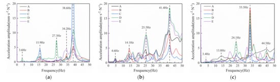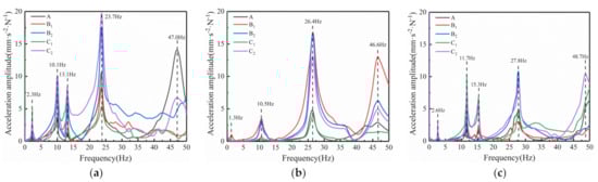 After filtering the accelerometer signal at the measuring point of the tree and performing Fourier transformation, the vibration spectrum curve of the test ginkgo tree was obtained. The spectral characteristics for the different tapping positions on the branches of the monopodial tree are shown in Figure 7. Judging from the generated vibration spectrum curve, since different side branches of the same fruit tree did not have exactly the same vibration characteristics, producing a strong vibration response for the monopodial branching fruit tree would be difficult under the excitation of a single frequency. This point is consistent with the conclusions of numerous researchers. To make the fruit tree produce a strong vibration response, a non-single-frequency excitation would have to be applied. He [28] adopted sweeping frequency excitation for vibration harvesting; San [40] adopted a double eccentric block vibration device with phase difference.
