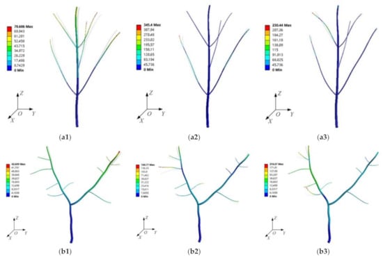Vibration models of monopodial branching tree 1 at (a1) 3.5 Hz, (a2) 15.7 Hz, and (a3) 33.4 Hz; Y-shaped sympodial branching tree 4 at (b1) 2.3 Hz, (b2) 10.1 Hz, and (b3) 24.5 Hz.