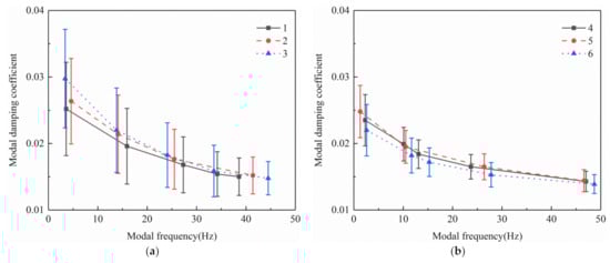 The modal damping coefficients for the different orders of the spectrum curves in each measurement point of the monopodial branching tree are presented in Figure 10a. The damping coefficients of the three test sample trees decreased as the natural frequency increased. There was little difference between the damping coefficients for test ginkgo trees with similar natural frequencies. The monopodial branching damping coefficient was 0.0148–0.0298. The fundamental frequency damping coefficients were between 0.025 and 0.03, and gradually decreased to around 0.015 as the frequency was increased. This means that when trees vibrate at higher frequencies, the damping is small, and the energy dissipation is weak. The standard deviation of the fundamental frequency damping coefficient was between 0.00642 and 0.00741, indicating that the damping coefficients at different test positions are comparatively different. The fundamental frequency damping coefficient of the main stem was greater than the coefficient of the side branches since damping is positively correlated with branch diameter. Since the trunk diameter is significantly larger than the side branches, the fundamental frequency damping in the trunk is greater than in the side branches. However, as the frequency increases, the damping coefficients at different measuring points tend to be similar because the error band is reduced. A smaller error band means that the damping at the main trunk decreases more rapidly as the natural frequency increases, compared to the decrease in the side branch damping coefficient. Above 30 Hz, the damping coefficients were 38.9–50.3% lower than the fundamental frequency and the standard deviation was 47.6–66.3% lower than the fundamental frequency. Within the general excitation frequency of 10–25 Hz, the damping coefficient also dropped by 18.8–38.7% and the standard deviation dropped by 8.3–39.9%. These results suggest that using an appropriate frequency to excite monopodial branching ginkgo trees can reduce energy dissipation in excitation.
