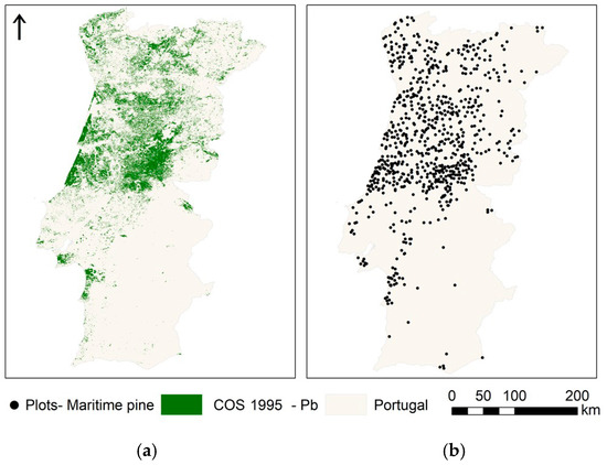 Maritime pine study area: (a) land cover map (COS 1995); and (b) forest inventory plots (1995) in pure Maritime pine stands (n = 739).