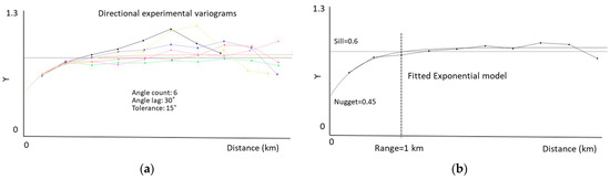 (a) Directional variograms (angle lag 30°; tolerance 15°); and (b) adopted omnidirectional variogram.