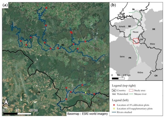 (a) Study area and inventory plots. (b) Location of study area within the Meuse catchment area.