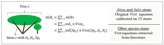 Diagram of the field estimation of tree biomass. t = tree index, s = stem index within the tree t, N = number of stems within the tree t, AGB = aboveground biomass, wd = wood density retrieved from [], Vtot = total wood volume, Sp = species, D = diameter, H = tree height. A new total volume equation was developed in this study for Alnus and Salix. For other species, volume equations were retrieved from [,].