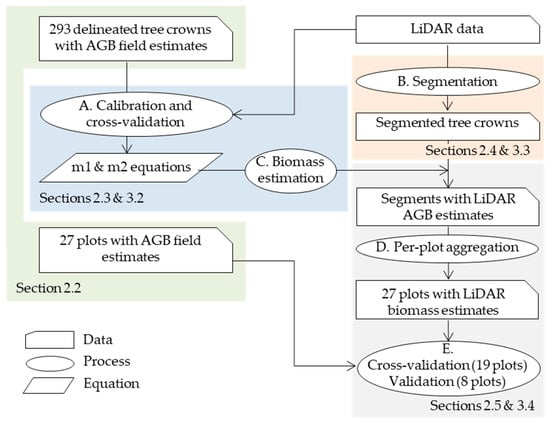 General workflow for the validation of biomass remote sensing estimates. (A–E) Processes are described in the text of Section 2.5.