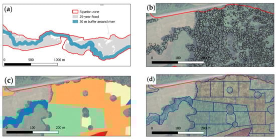 (a) Delineation of riparian zone as the sum of two envelopes: area flooded every 25 year and 30-m buffer on either side of the river. (b) Segmentation of tree crowns within the riparian zone. (c) Morphological filtering on the segmented tree crowns and first division into zones of similar age (each color corresponds to a different age). (d) Division of this envelope into vegetation units (VUs) of approximately 0.3 ha.