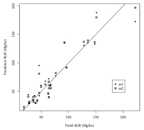 Predicted AGB (Mg/ha) according to field AGB for the 27 plots studied and for the two models m1 (based on CHM) and m2 (based on CHM and point cloud).