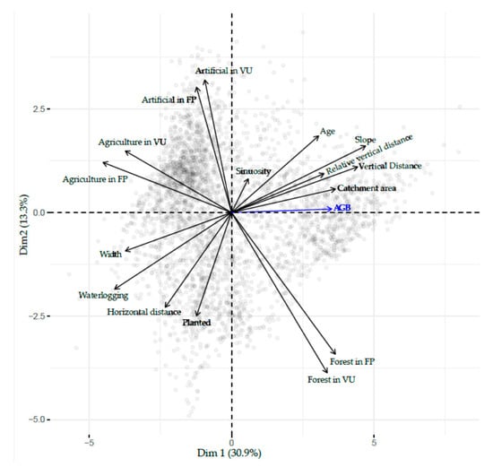 Results of principal component analysis on all explanatory variables. AGB was plotted as a supplementary variable.