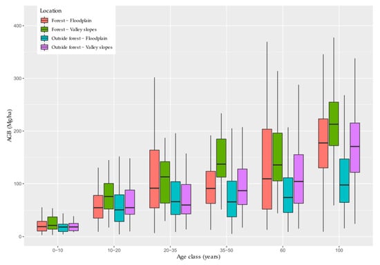 Aboveground biomass of VU depending on their age and location inside (Forest in VU > 50%) or outside forest, in the floodplain (Relative vertical distance < 1) or on valley slopes. Age classes “60” and “100” are indicative values, see Section 2.7.