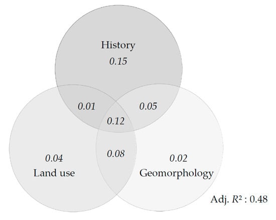 Explanatory variables were standardized prior to statistical analyses. A PCA (principal component analysis) was first realized in order to explore relationships between explanatory variables. A variance partition was carried out using the vegan package [] in order to explain the share of variance in VU biomass explained by each thematic group (history, land use and geomorphology). All variables were used at this stage. A set of variables that were poorly correlated with one another (i.e., whose absolute Pearson’s correlation coefficient with other selected variables was less than 0.5) was then constituted. A MLR (multiple linear regression) model predicting VU biomass was then adjusted with the following equation: