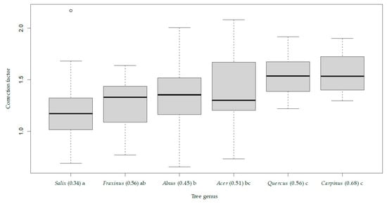 Value of the correction factor of the m2 model ] depending on tree species. The thick line corresponds to the median correction factor. The species are ordered according to the average of the correction factor, and the letters abc correspond to the groups separated by a Wilcoxon test. The values in brackets correspond to the wood densities for each species in Mg/m3.