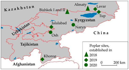 The study sites were distributed across Central Asia from SE Kazakhstan over Kyrgyzstan, including the Ferghana Valley, into Tajikistan (Figure 1), with the aim to capture different growth rates of the cultivars across the climate zones and elevation range relevant for the potential use of those poplar cultivars in agroforestry or plantations [15]. The final selection of the particular sites here and their different management, as explained below, are partly owed to the availability of sites and resources.