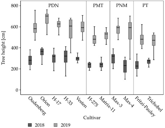 Box plots of tree heights in Almaty at the end of the growing seasons 2018 (dark grey) and 2019 (light grey). Parentages: PDN—P. deltoides x nigra, PMT—P. maximoviczii x trichocarpa, PNM—P. nigra x maximoviczii, PT—P. trichocarpa.