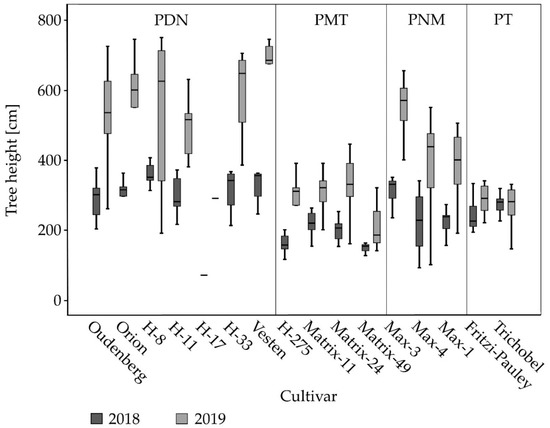 Box plots of tree heights in Bishkek I at the end of the growing seasons 2018 (dark grey) and 2019 (light grey). Parentages: PDN—P. deltoides x nigra, PMT—P. maximoviczii x trichocarpa, PNM—P. nigra x maximoviczii, PT—P. trichocarpa.
