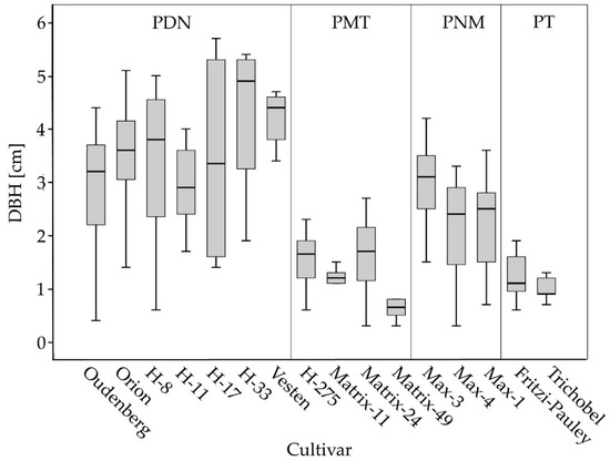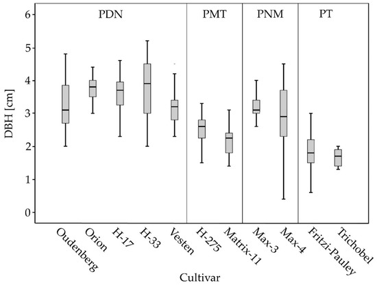 Box plots of DBH in Almaty at the end of the growing season 2019. Parentages: PDN—P. deltoides x nigra, PMT—P. maximoviczii x trichocarpa, PNM—P. nigra x maximoviczii, PT—P. trichocarpa.