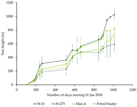 Mean tree heights by parentage groups, expressed by one cultivar per parentage (H-33—PDN, H-275—PMT, Max-4—PNM, and Fritzi-Pauley—PT) from planting time in April 2018 to end of the third season (Oct. 2020) on the site Bishkek I.