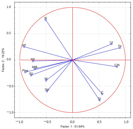 The projection of variables on a plane of the first and second factor in soil around deadwood (III, IV—decomposition class; MIB—mean individual carabid biomass, NI—the number of carabid individuals; NS—the number of carabid species; SV—volume of stumps; LV—volume of logs; DH—dehydrogenase activity.