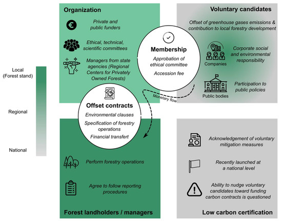 To facilitate the comprehension of this section, Figure 1 summarizes the general functioning of the two nonprofit organizations: voluntary candidates, either private companies or public bodies, become members of the carbon offset organization after agreeing to its ethical conditions. They provide funding that is managed by forest practitioners. The organization then contracts carbon offsets with forest landholders.