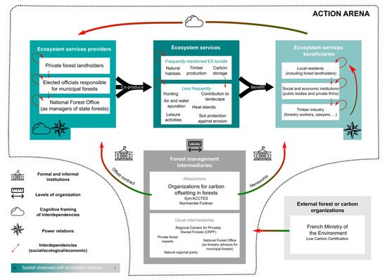 NF and Sylv’ACCTES have emerged as new intermediary forest organizations, aiming to bring together forest managers (carbon storage providers) and forest ES beneficiaries around carbon storage projects. Although the formal institutionalization of NF and Sylv’ACCTES is undeniable, their strategy to manage efficient, sustainable, and multifunctional projects for forest carbon storage must be questioned in the light of the actual outcomes. Figure 2 illustrates the discussion using the conceptual framework of Barnaud et al. for ES, social interdependencies, and collective action.