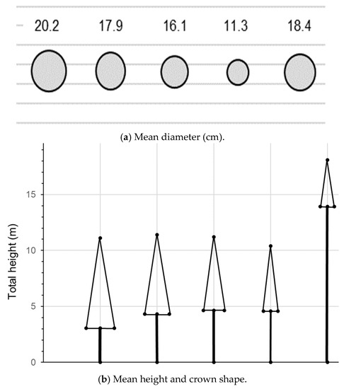 Profiles of lodgepole pine crop trees (large overstory trees) with three densities of thinned stands, an unthinned stand, and an old-growth stand in 2013 at 20–25 years after precommercial thinning: (a) mean diameter (cm), (b) mean total height (m) and crown shape, and (c) mean merchantable volume (m3/ha) and number of trees/ha.