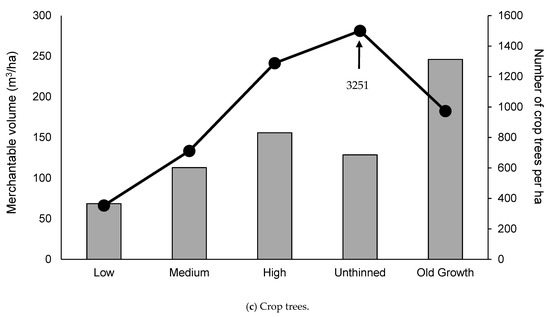 Mean basal area was less in the low-density than old-growth stands but similar to the other thinned stands. In addition, mean merchantable volume of crop trees seemed to be higher in the old-growth than other stands (although not statistically significant) owing to greater height growth, but the medium-density, high-density and unthinned stands were comparable in this economic metric. There were high numbers of crop trees in the unthinned stands but the estimated merchantable volume was similar to the thinned stands because of the relatively small mean diameters.