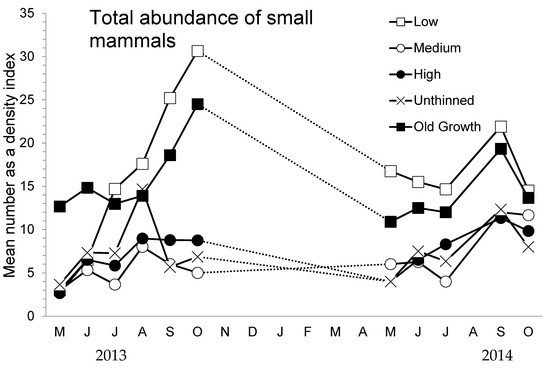 Mean (n = 3 replicate sites) total abundance of forest-floor small mammals as an index based on Jolly-Seber population estimates 2013 to 2014 in three thinned, unthinned, and old-growth stands in south-central British Columbia, Canada. Datapoints indicate individual trapping weeks each summer (May to October) and dots indicate the winter period when we did not sample populations.
