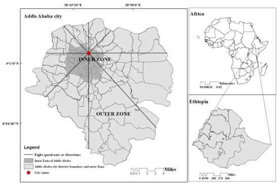 Addis Ababa urban core zone, inner urban zone and peri-urban zone and eight directions.