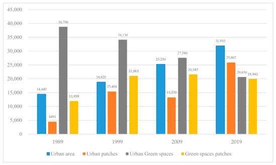 Similarly, the results also showed that the number of urban patches (NP) generally increased but fluctuated in parallel with the urban expansion, i.e., increased and decreased in the study periods. Referring to Figure 2, the highest NP increase was observed in the third period compared to the first and the second period. For instance, in 1989, the NP of urban patches were 4491 and this number increased to 15,404 (242.9%) by 1999, while it decreased from 15,404 to 13,270 (13.8%) between 1999 and 2009. In the third period, however, the NP further increased (nearly doubled) from 13,270 to 25,867 (94.7%), showing differentiation and isolation of urban patches i.e., forming a non-contagious patches. The increase in the number of urban patches in this period suggested that the pattern of urban growth mainly characterized dispersion or spontaneous development.