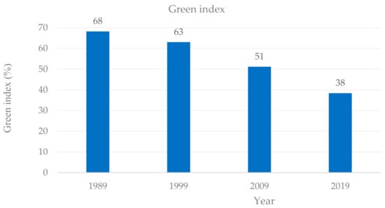 In addition, the result of the green index (GI) provided similar evidence on the steady decline of UGS in the city. As shown in Figure 3, the GI was 68% in 1989 and this proportion declined to 63% in 1999 and further reduced to 51% in 2009, reporting fast destruction of the UGS over the study period. By the end of 2019, the GI of the city decreased to 38% and shared less than half the city’s urban landscape, witnessing rapid depletion of the UGS. Similarly, the rate of GI change was 0.7, 1.9 and 2.4 per year in the first, second and third periods and demonstrating growing trend of UGS destruction over the study period due to uncontrolled urban growth.