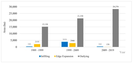 Finally, newly grown urban patches between two times periods were detected by spatially overlying two temporally adjacent maps (1989–1999, 1999–2009 and 2009–2019) to identify the pattern of growth, e.g., infill, edge expansion, and an outlying.