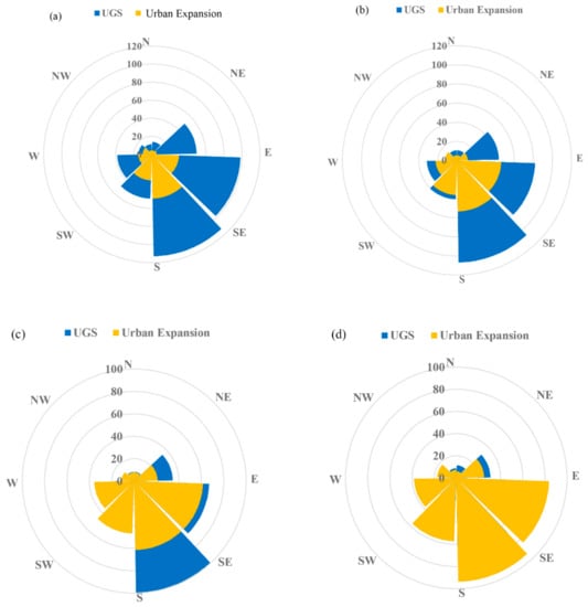 The spatio-temporal dynamics of urban expansion and the UGS change were also analyzed for eight different directions using equal-fan analysis. Referring to Figure 5 urban expansion demonstrated distinct magnitude and direction change in eight directions over the 30 years. The urban area mainly expanded in the SEE, SSE, and SSW directions from 3026 ha to 4650 ha, from 4990 ha to 5337 ha and from 2891 ha to 3622 ha, respectively, at the beginning of the study period. In the second period, however, urban growth shifted to SEE, NEE and SSW and increased from 4650 ha to 6154 ha, from 1140 ha to 2098 ha, and from 3622 ha to 4672 ha, with an annual rate expansion of 4.78%, 3.62% and 2.85%, respectively. As urbanization intensified in the third period, the urban expansion further shifted to the SSE and NEE directions and increased from 6145 ha to 9365 ha and from 2098 ha to 2011 ha, respectively. During this period, urban expansion in the SEE direction was maintained and increased from 6154 ha to 8378 ha. The rate of urban expansion in SEE, NEE and SEE was 6.03%, 3.62%, and 4.78%, respectively, reporting the city expanded mainly in the SEE directions during the study period.
