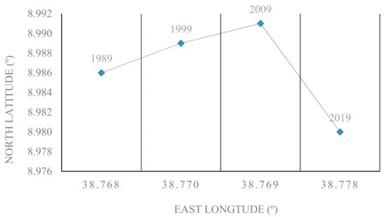 Center of gravity of dynamic change in urban area in Addis Ababa from 1989 to 2019.