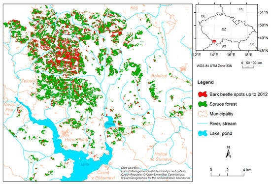 Wind damage to forests and subsequent spruce bark beetle (Ips typographus L.) outbreaks have increased in Central Europe in recent decades [1]. Bark beetle outbreaks are closely related to wind-caused forest damage, and the two factors interact to create wind–bark beetle disturbance systems [2]. There are also connections between bark beetle outbreaks and other forest disturbances related to climate change [3,4]. Rising mean annual temperatures, increases in drought duration and intensity, and shifts in growing seasons increase the risk of forest infestation by bark beetles [5]. To respond to this problem, forest managers require adequate forest management strategies based on knowledge of the forest damage spatial distribution and factors influencing the risk of wind damage and bark beetle dispersal [6]. The understanding of bark beetle dispersal processes and spatial patterns is important for the effective management of infested forests [7]. Forestry decision support systems profit from the integration of high-resolution remote sensing data, forest mapping and field inventories, advances in silviculture and forest ecology, and the use of modern statistical and machine learning approaches [8,9,10].
