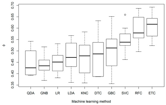 Overall performance as indicated by the mean phi coefficient was slightly lower for the best RFC-based model than for the best ETC-based model. However, performances for these best models were not significantly different. Performance for the other top FDM models was significantly different from performance for the best ETC- and RFC-based models (Table 5). Moreover, as evident in Figure 5, most of the ETC-based FDMs out-performed the FDMs generated by the other MLAs.
