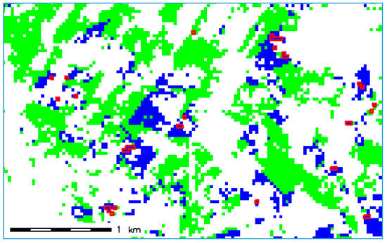 Preview of the bark beetle spots generated by the top ETC-based model. Green color represents unaffected spruce forest; blue color represents bark beetle infestation spots generated by the top ETC-based model; red color represents damaged forest identified on LANDSAT images. The MLA codes are given in Table 3, and the variables of the top models are listed in Table 4.