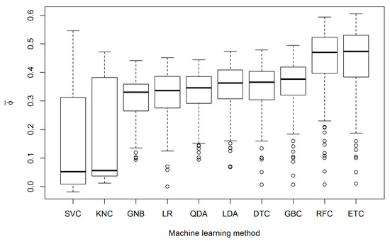 Box plots of mean phi coefficients () of FDMs generated by MLAs. Box plots show median plus upper and lower quartiles for mean phi coefficients of all FDMs generated by a given algorithm. Minimum and maximum values are indicated by the upper and lower whiskers (1.5 × interquartile range). Circles are outliers. See Table 3 for MLA codes.