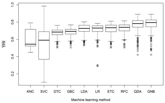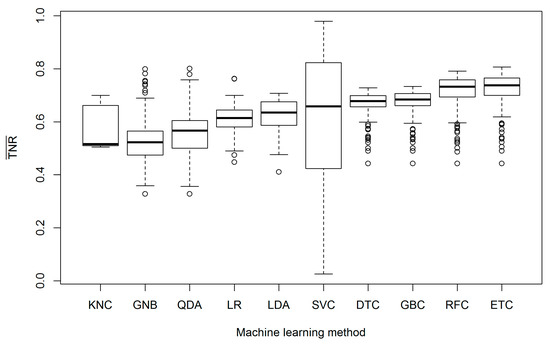 The mean TPRs were highest for the SVC-, QDA-, and GNB-based models (Figure 6). These models were highly sensitive because they significantly overestimated the area of damaged forest. On the other hand, SVC also generated several FDMs with low specificities (Figure 7).