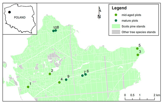 Distribution of sample plots in mid-aged and mature Scots pine stands in northwestern Poland.