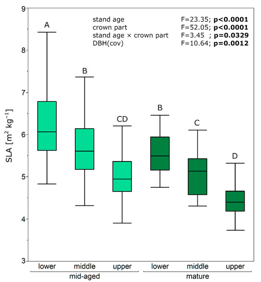 Boxplots with specific leaf area (SLA) of needle different crown parts (lower, middle, and upper) of Scots pine sample trees growing in mid-aged and mature stands. Results of the ANCOVA are presented. Different letters indicate significant differences (Tukey’s honestly significant difference test) between stands of different ages and crown parts (p = 0.05). Statistically significant differences at p < 0.05 are shown in bold.