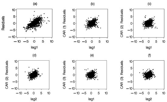 Model 1 and model 5 with different crown variables were fitted using the generalized nonlinear least-squares method. The initial fitting of the models without the error structure resulted in strong autocorrelation. As an example, the autocorrelation observed in the d predictions with the Clark model is shown in Figure 1. This correlation trend disappeared when a third-order continuous autoregressive error structure CAR (3) was added in the model fit.