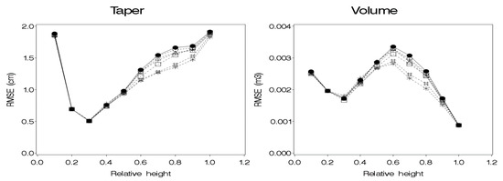 8. Li, R.; Weiskittel, A.R. Comparison of model forms for estimating stem taper and volume in the primary conifer species of the North American Acadian Region. Ann. For. Sci. 2010, 67, 302. [Google Scholar] [CrossRef]