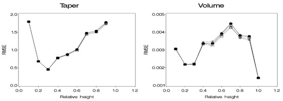 The accuracy of the models was also assessed for different stem sections. The stem was divided into ten sections (relative heights), and RMSE was calculated for diameter and volume in each section. The RMSEs were plotted against relative heights to compare the models’ performance in predicting diameter and volume. Taper simulations were generated to analyze the influence of different crown variables on taper formation of Dahurian larch, Korean spruce, and Manchurian fir.