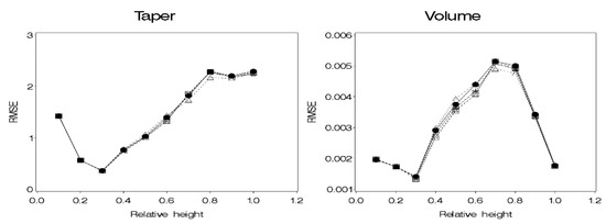 The plots of RMSE against relative heights providing the diameter and volume predictions of the models are displayed in Figure 2, Figure 3 and Figure 4. All models indicated similar diameter predictions along the entire stem for Korean spruce and Manchurian fir. However, for volume predictions, the models with HCB and CR showed slightly better results for 50–90% relative heights of Korean spruce. The models with HCB and CR accompanied by the model with CL marginally improved the predictions for 40%–60% relative heights of Manchurian fir. The models with CL and CD behaved inconsistently for middle and upper stem sections of Korean spruce and Manchurian fir, respectively. For Dahurian larch, although the models showed similar performance for the basal log and middle stem (relative heights, 0%–50%), they behaved differently for upper stem sections. In general, the models with crown variables performed better than the original model for the relative heights of >50%–90%. The model with CL showed the best results, which was followed by the model with CR for Dahurian larch.