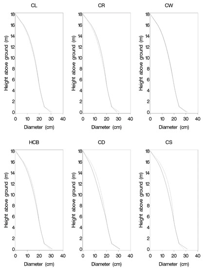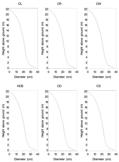 In general, using crown variables as additional covariates is not warranted due to the difficulties of acquiring crown measurements coupled with a minor increase in the predictive abilities of taper models [29,30]. However, [31] suggested that the objective of using additional covariates should not only be to increase model accuracy but also to confirm biologically acceptable extrapolations.