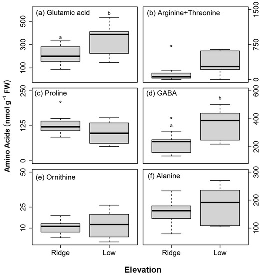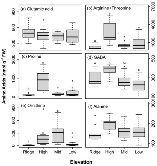 Foliar free amino acid concentrations in Himalayan cedar along an elevational gradient of 2649 to 2371 m at Kufri Mountain in the foothills of the Northwestern Himalayas in 2009. Data are presented as box and whisker plots (n = 10). Letters represent significant differences between sites (p ≤ 0.05).