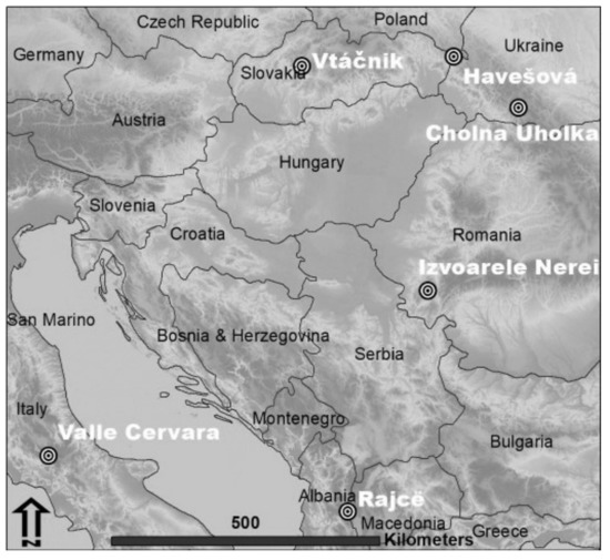 Position of primeval beech forests (marked by black concentric circles) in East-Central, South-Eastern, and Southern Europe.