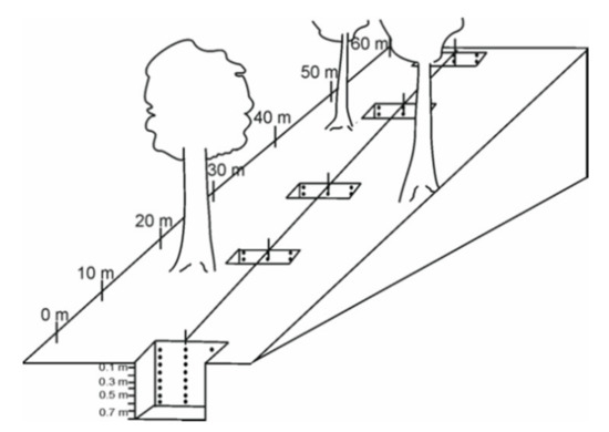 Soil samples were taken from soil profiles aligned along a 60 m long transect placed in segments featuring optimum stage of development, identified according to [54]. There was one 60 m transect in each locality, with five soil profiles excavated to 0.8 m depth or bedrock boundary (Figure 2).